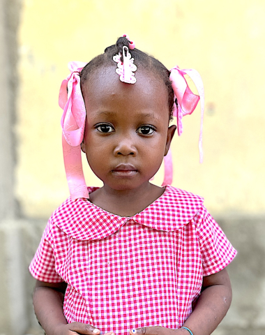 My house is made from block and has a tin roof. My mother is a street vendor and I help out at home by fetching water. I like to play tag and with dolls.