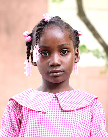My house has a tarp. I live in the village Lompre. I help out at home by cleaning the house. I like to play with dolls.